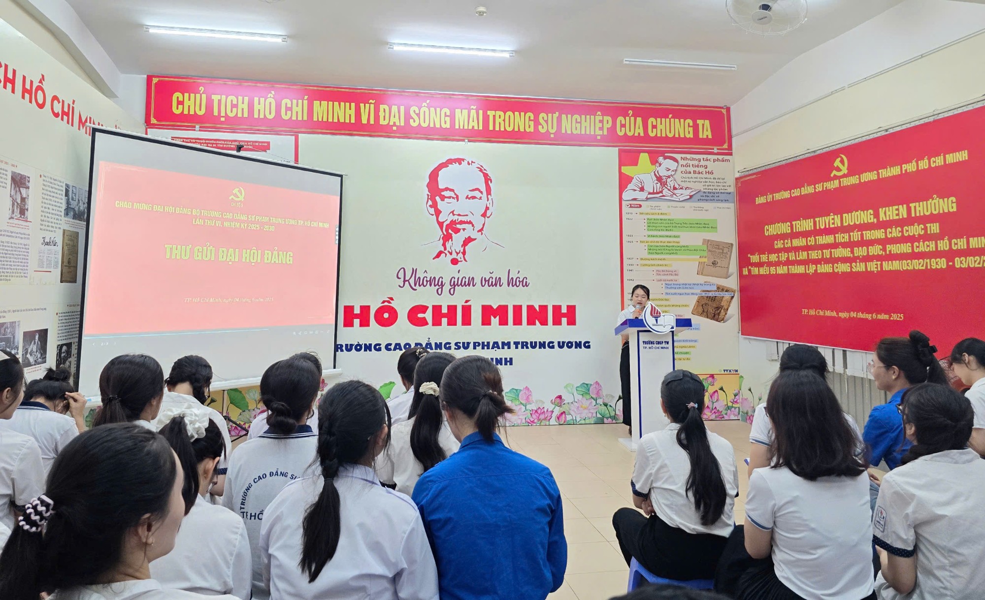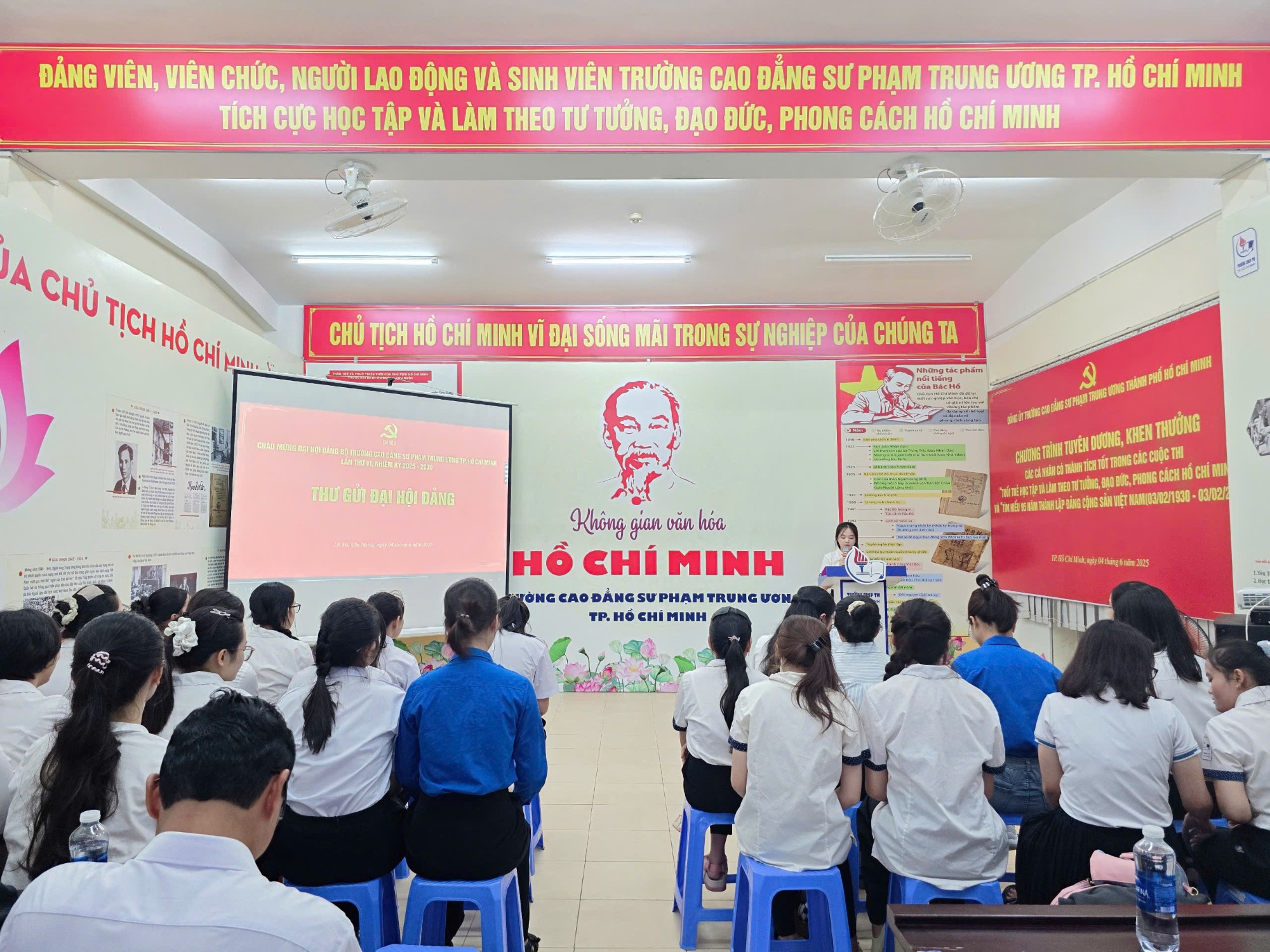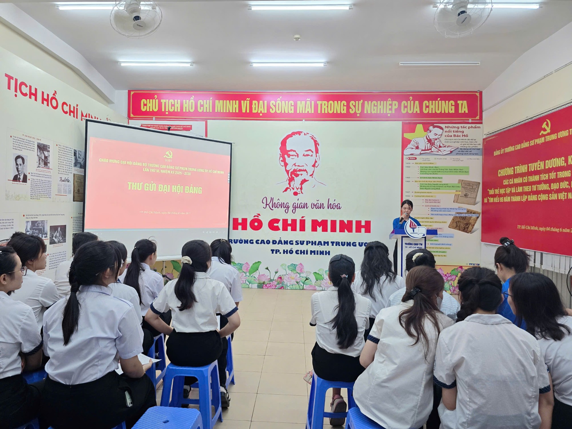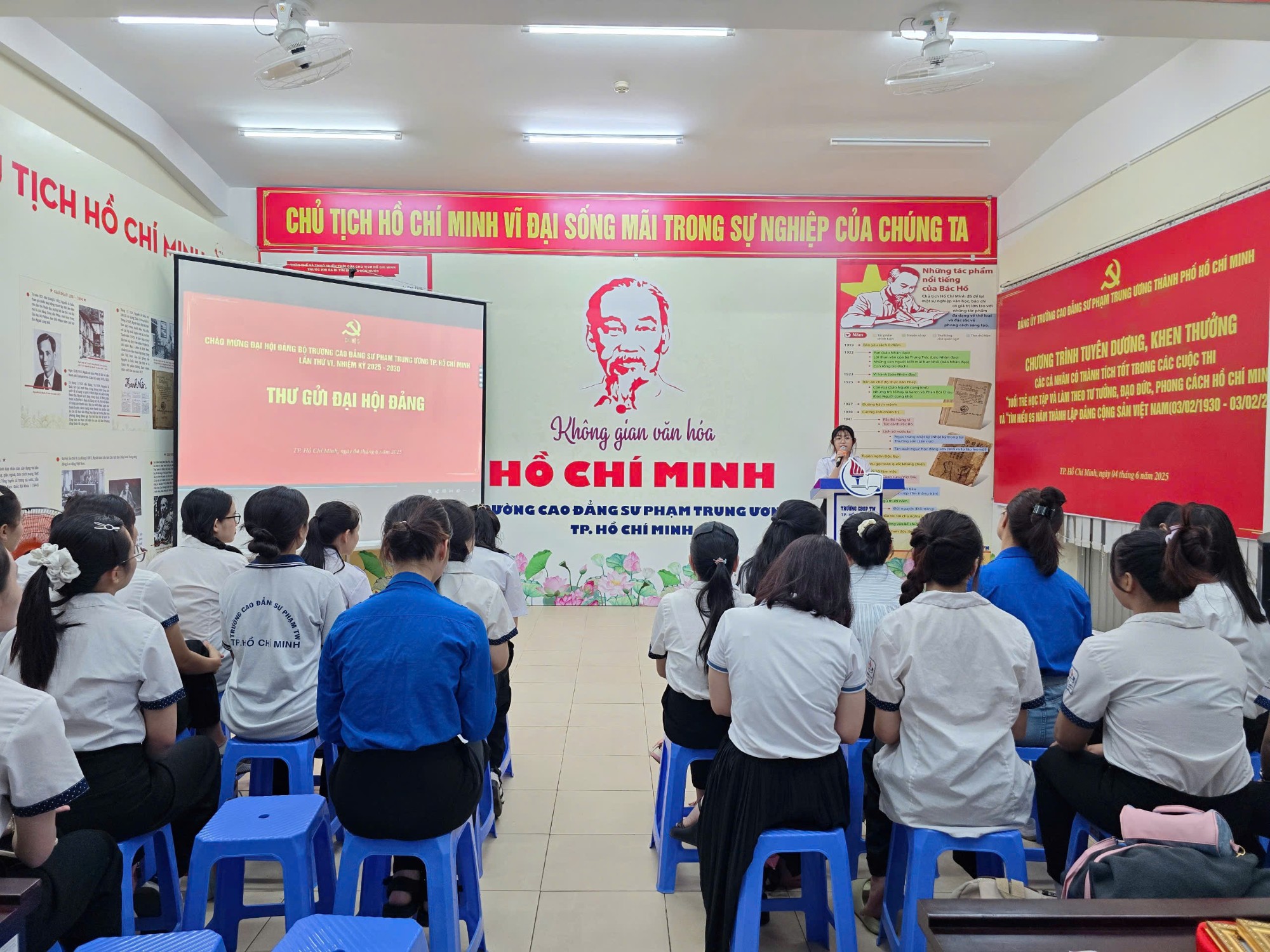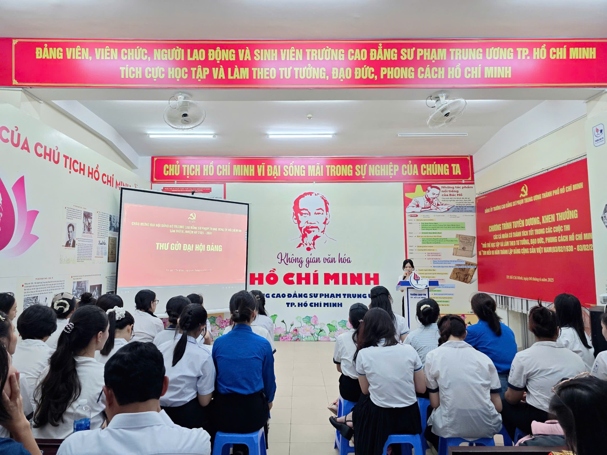 Thiết thực chào mừng Đại hội Đảng bộ Trường Cao đẳng Sư phạm Trung ương TP. Hồ Chí Minh lần thứ VI, nhiệm kỳ 2025 – 2030, nhằm tuyên truyền, cổ vũ, động viên cán bộ, đảng viên và sinh viên về ý nghĩa, tầm quan trọng của Đại hội đảng bộ Trường Cao đẳng Sư phạm Trung ương TP. Hồ Chí Minh lần thứ VI, nhiệm kỳ 2025 - 2030, thông qua đó tạo sự thống nhất về nhận thức, tư tưởng và hành động, tích cực tham gia thực hiện các phong trào thi đua lao động, học tập, góp phần thực hiện hoàn thành các mục tiêu, chỉ tiêu của Đảng bộ đề ra. Chi bộ 5 tổ chức hoạt động Thư gửi Đại hội Đảng. Đây là dịp để đảng viên trẻ và quần chúng ưu tú thuộc chi bộ gởi gắm những tâm tư, tình cảm và những kỳ vọng đối với Đại hội Đảng bộ Trường.