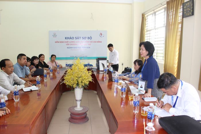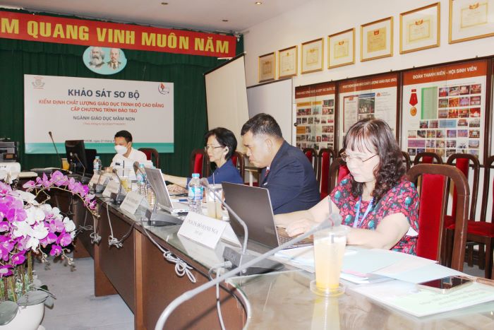 Đoàn ĐGN tiến hành khảo sát thực tế khuôn viên của Trường; tìm hiểu sơ bộ điều kiện làm việc, giảng dạy, nghiên cứu tình hình học tập, làm việc của sinh viên và cán bộ, giảng viên, nhân viên trong toàn trường. Đồng thời, Đoàn đã kiểm tra sơ bộ công tác chuẩn bị cho hoạt động đánh giá chính thức: Hồ sơ minh chứng phục vụ ĐGN CTĐT ngành Giáo dục Mầm non trình độ Cao đẳng.