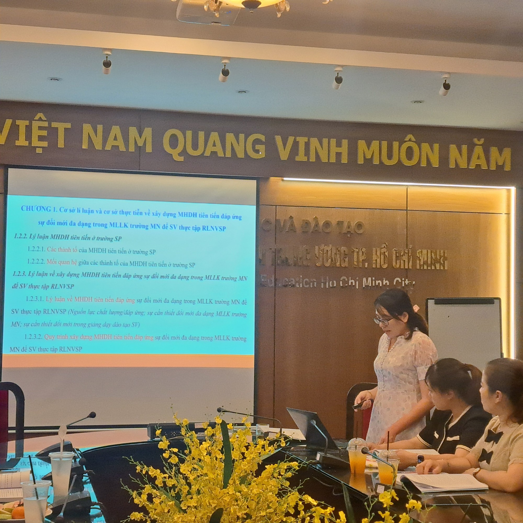 Vào lúc 13h30 Thứ Tư, ngày 13 tháng 12 năm 2023, Trường Cao đẳng Sư phạm Trung ương Thành phố Hồ Chí Minh tổ chức hội đồng đánh giá, nghiệm thu cấp cơ sở nhiệm vụ nghiên cứu số 02: Xây dựng mô hình dạy học tiên tiến đáp ứng sự đổi mới đa dạng trong mạng lưới liên kết trường mầm non để sinh viên thực tập rèn luyện nghiệp vụ sư phạm thuộc Đề án "Đào tạo, bồi dưỡng nhà giáo và cán bộ quản lý giáo dục mầm non giai đoạn 2018-2025" năm 2023.